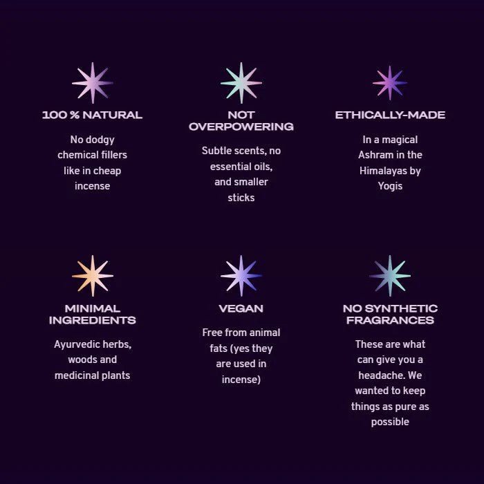 Rein natürliche Inhaltsstoffe: 100% natürlich aromatische ayurvedische Kräuter, Hölzer und Heilpflanzen. Frei von all dem Zeug, das man in billigen Räucherstäbchen findet, wie synthetische Duftstoffe, tierische Fette und chemische Füllstoffe. Auch frei von ätherischen Ölen. Vegan.