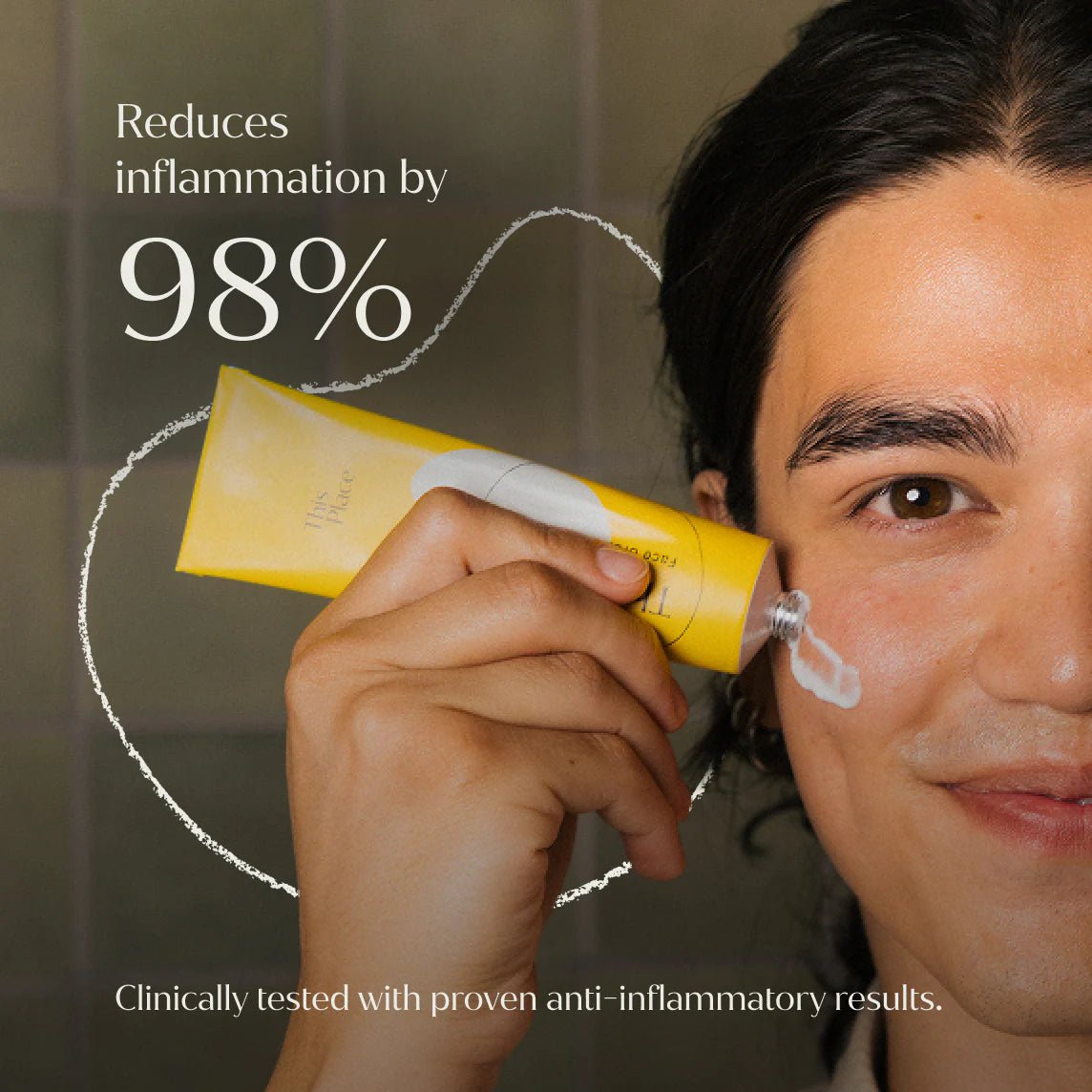 Beruhigende Gesichtscreme mit Zimtrinde, Sheabutter, Blauer Rainfarn, Hyaluronsäure und Zink. Die moderne Interpretation einer Zinkcreme von This Place.