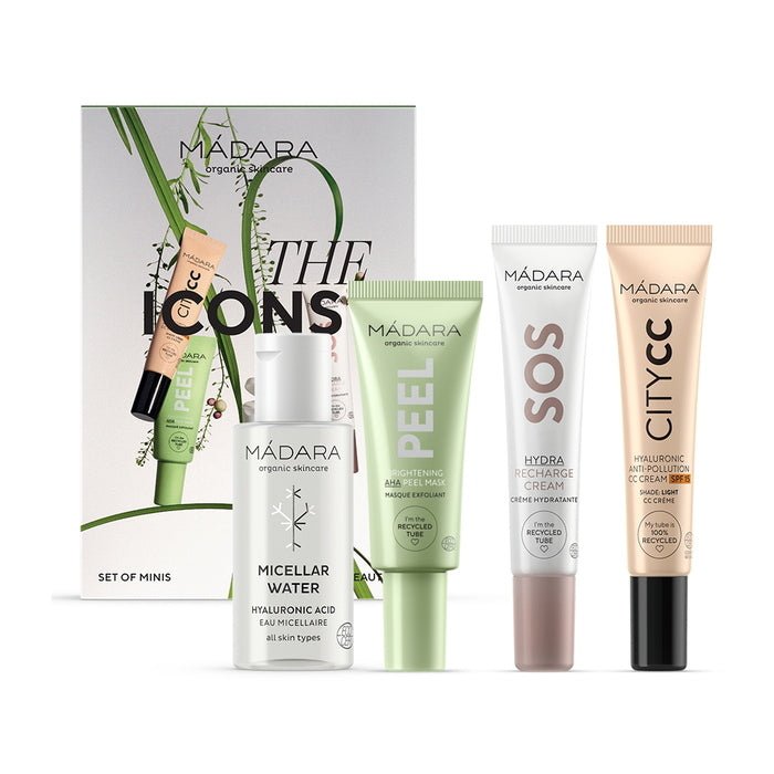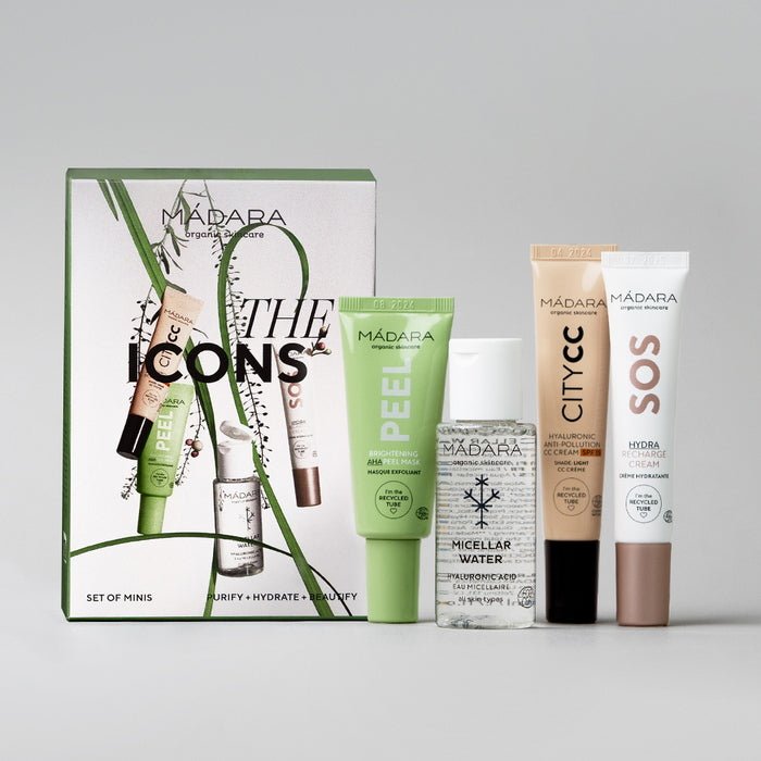 Das Icons Set wird im Mádara Werk in Riga, Lettland, mit 100 % Ökostrom aus erneuerbaren Energiequellen hergestellt. Alle Formulierungen werden in den Labors verantwortungsbewusst entwickelt. Sie sind hautfreundlich, biologisch abbaubar sowie frei von aggressiven Chemikalien und potenziellen Umweltschadstoffen. Mádara setzt umweltfreundliche Verpackungslösungen ein, wie z. B. Altkunststoff, recycelten Ozeanmüll und Restmaterialien, die von Zuckerrohr und aus der Holzproduktion stammen.