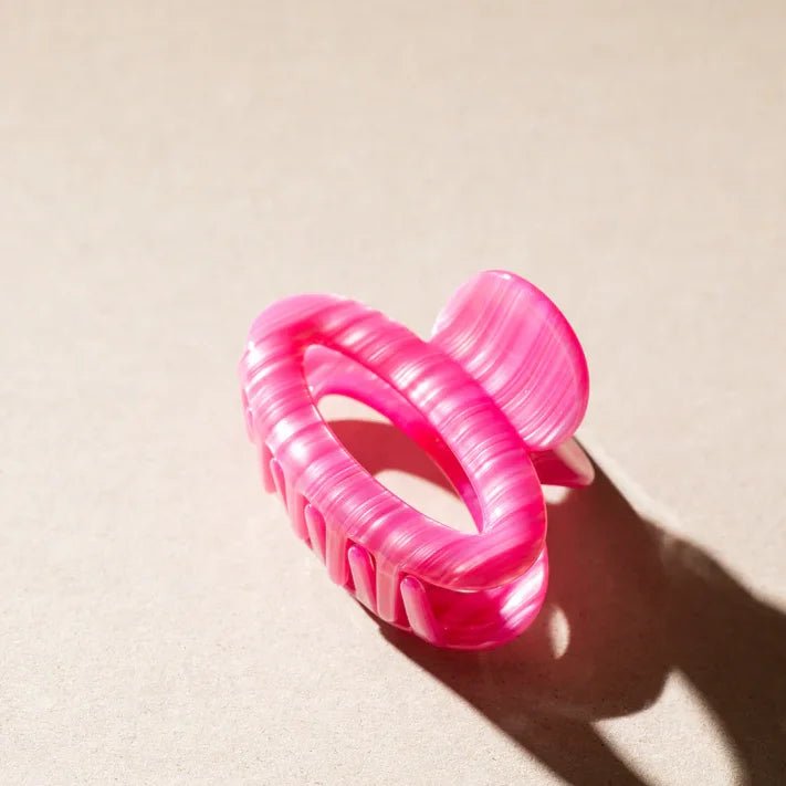 Die Aura Viva Haarklammer vereint modernes Design mit funktionaler Alltagstauglichkeit. Ihre ovale Form ist von Umläufen und Vollmonden inspiriert und verleiht dem Haar einen sanften, ruhigen Schwung. Das glänzende, rosa Cellulose-Acetat fängt das Licht ein und schafft eine subtile Tiefe für Ihren Look.