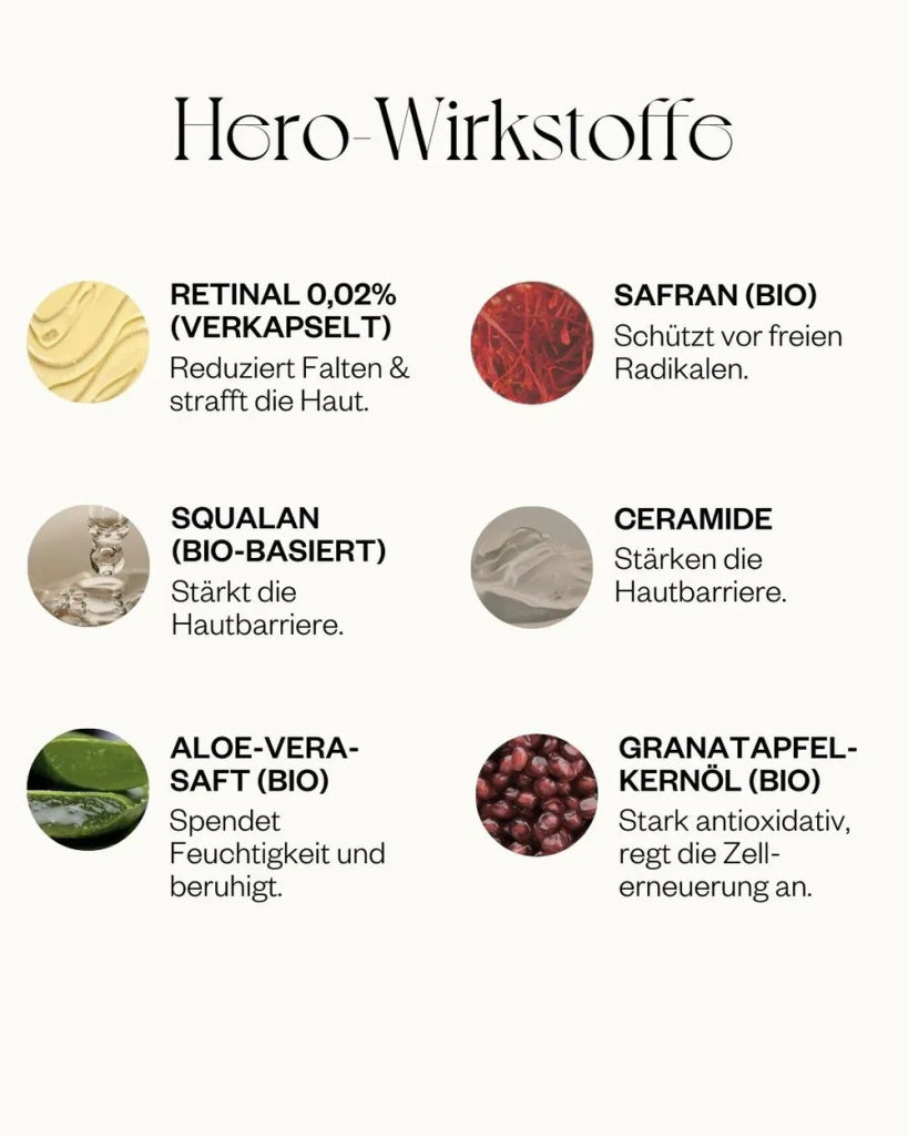 • Key Inhaltsstoffe: 0,02% naturidentisch verkapseltes Retinal, Safran, Ceramide, Squalan, Granatapfelkernöl, Aloe Vera