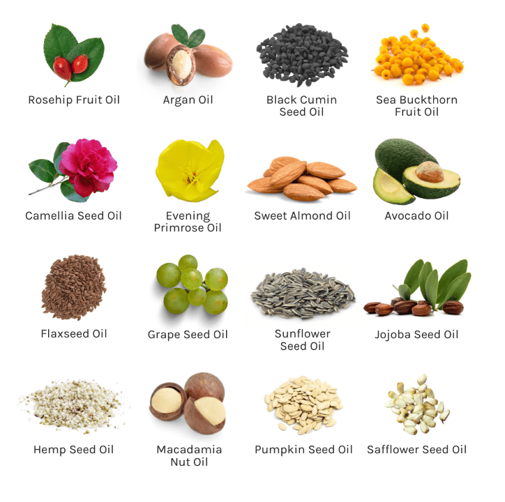 Safflower Seed Oil*, Avocado Oil*, Sweet Almond Oil*, Sunflower Seed Oil*, Grape Seed Oil*, Flaxseed Oil*, Pumpkin Seed Oil*, Macadamia Nut Oil*, Camellia Seed Oil*, Evening Primrose Oil*, Hemp Seed Oil*, Rosehip Fruit Oil*, Argan Oil*, Jojoba Seed Oil*, Sea Buckthorn Fruit Oil*, Black Cumin Seed Oil*, Vitamin E, Fragrance**.